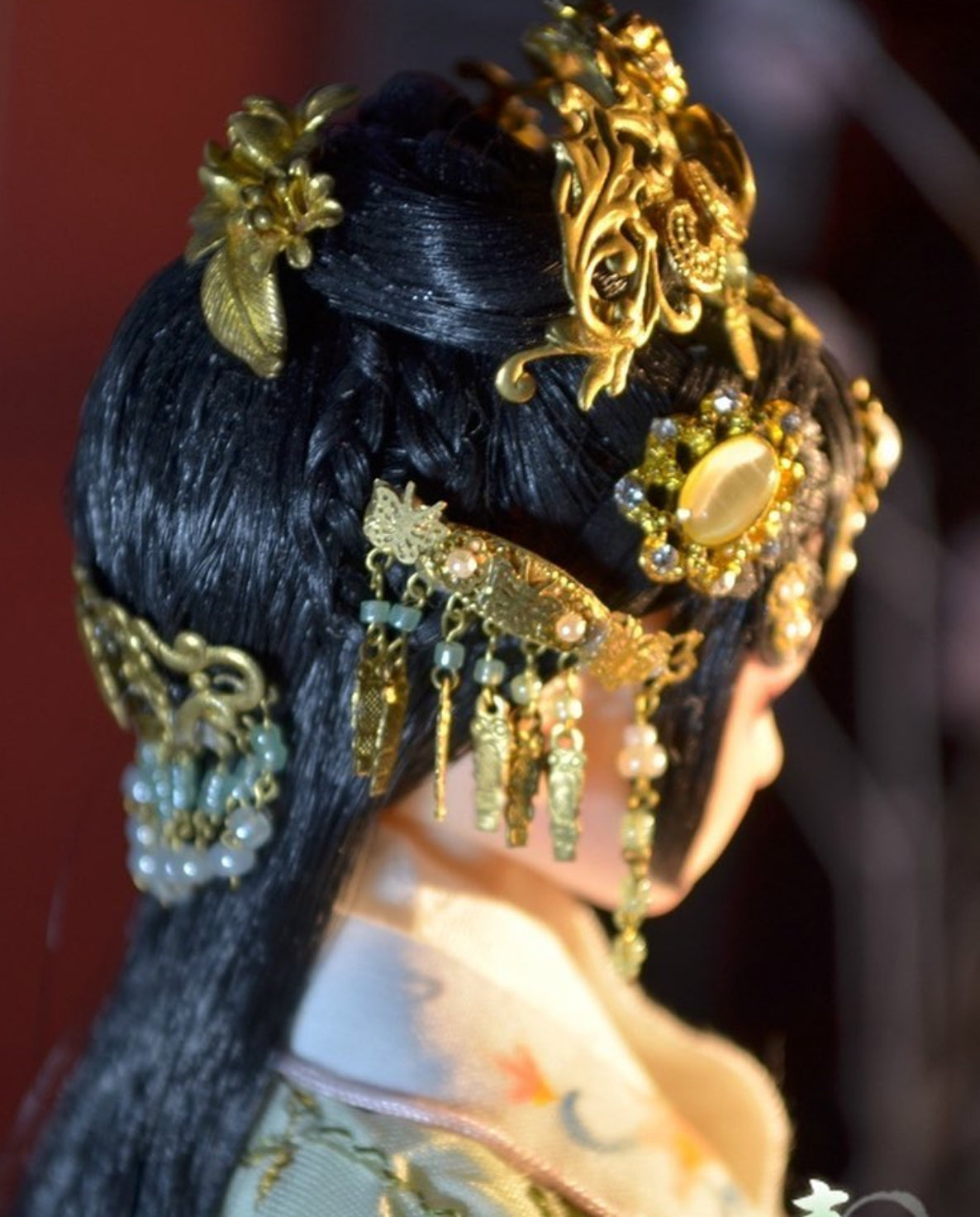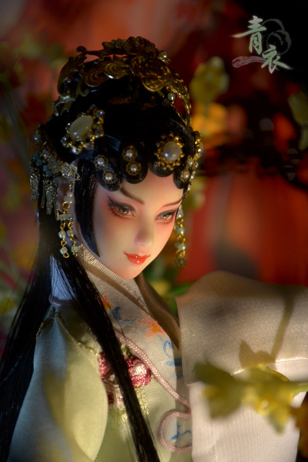 00000番の極細筆で彩色されたこの人形は、古典映画『覇王別姫』と、その優雅さと落ち着きで知られる京劇の伝統的な青衣(チンイー)役からインスピレーションを得ています。コレクションの中でも最も精巧なヘアスタイルは、植物由来のヘアジェルを用いて全て手作業でスタイリングされ、本格的なオペラ技法を忠実に再現しています。まさに唯一無二の作品と言えるでしょう。