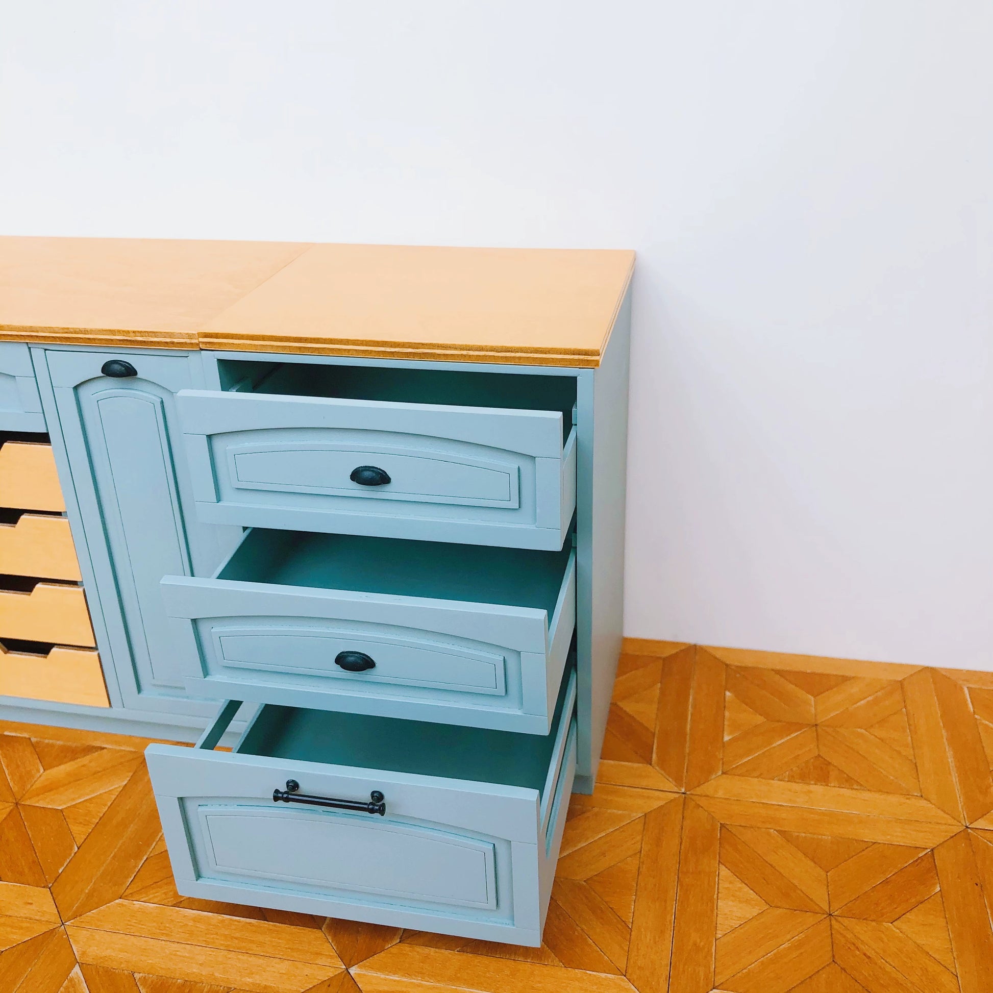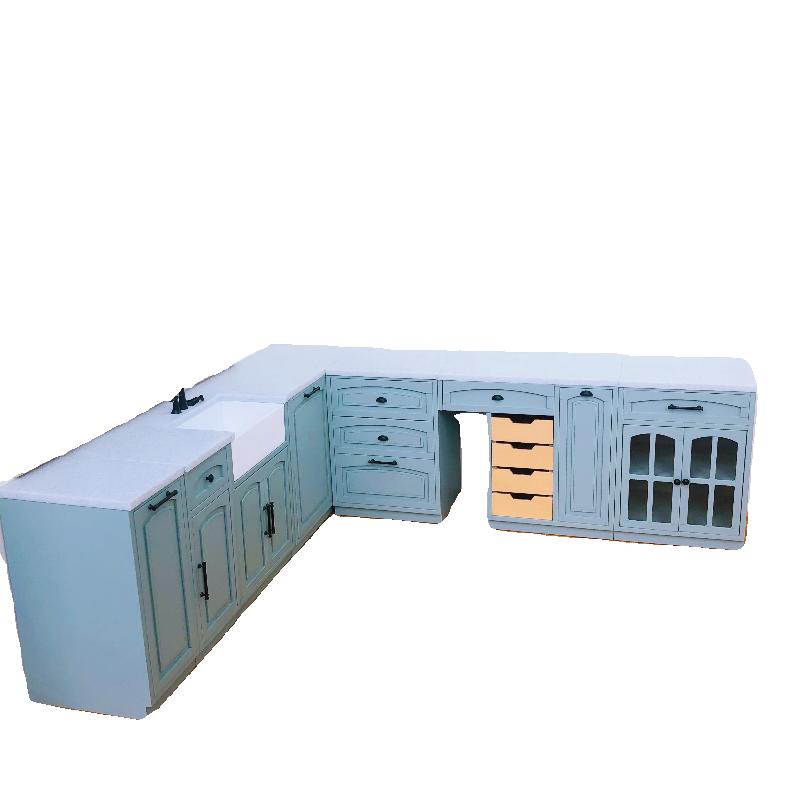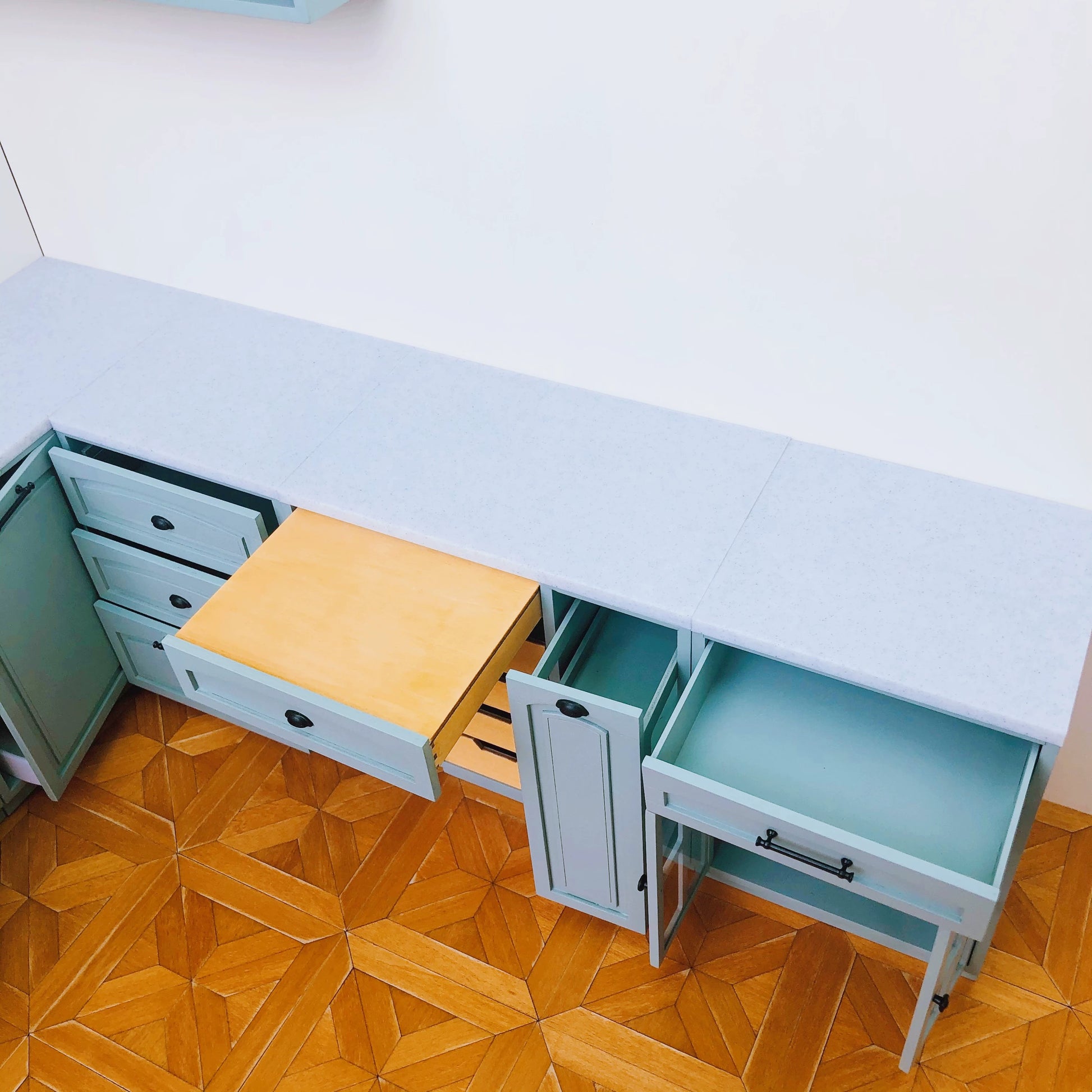 1/6スケール ドールハウス キッチン家具セット – 9ピース モジュラーキャビネット(ホワイト&ヴィンテージブルー) | BJD&ブライス ミニチュアキッチン