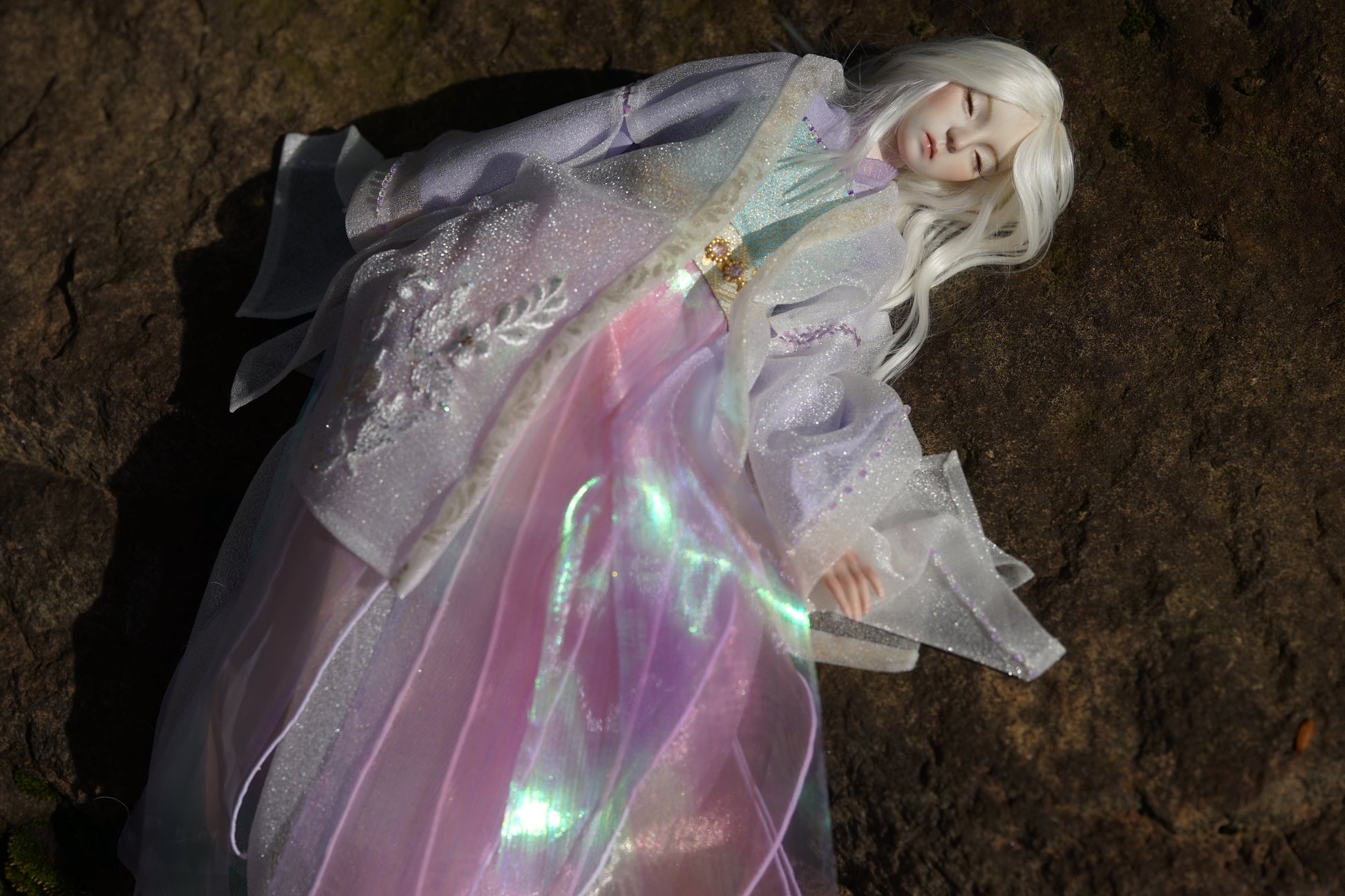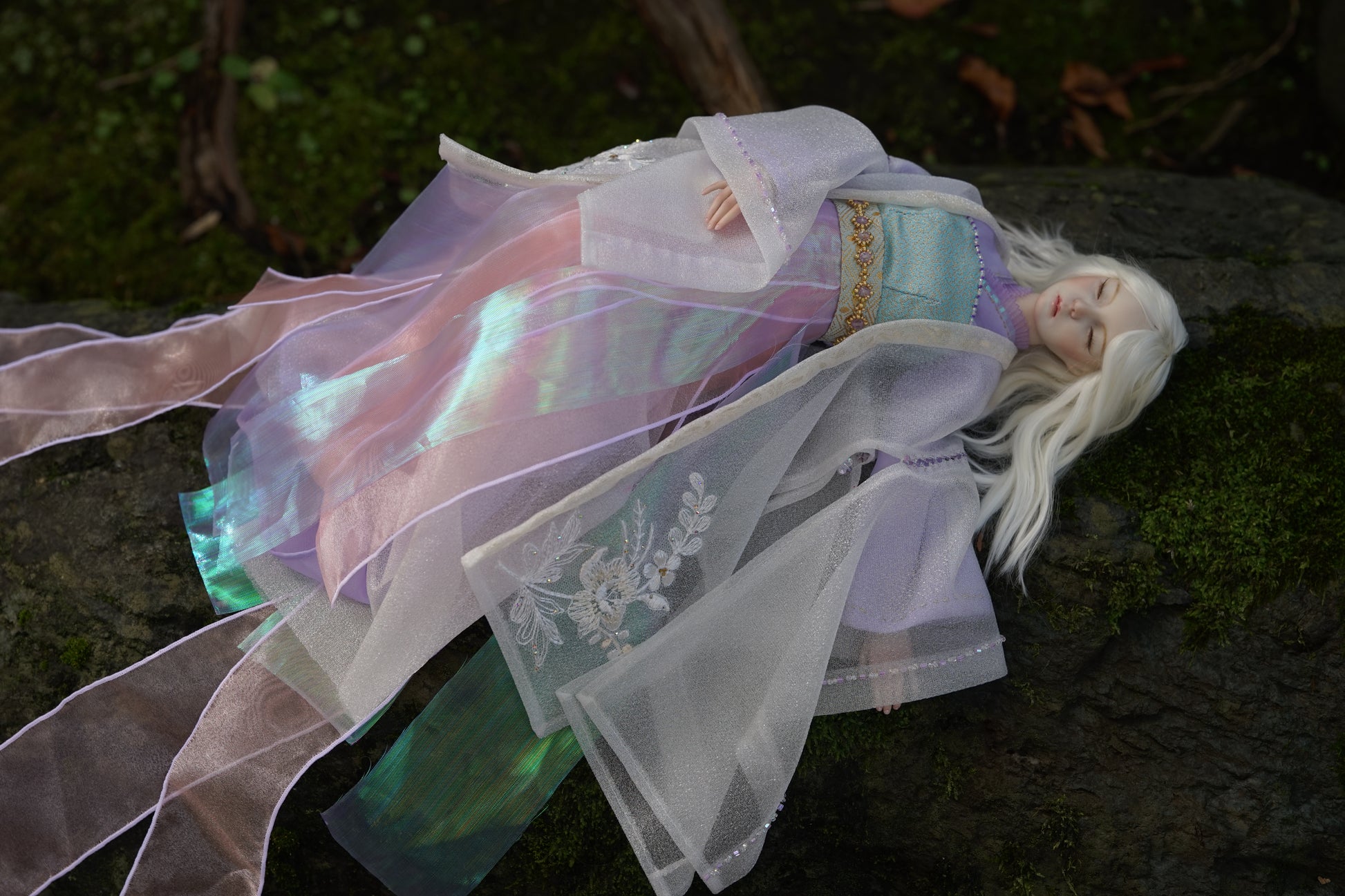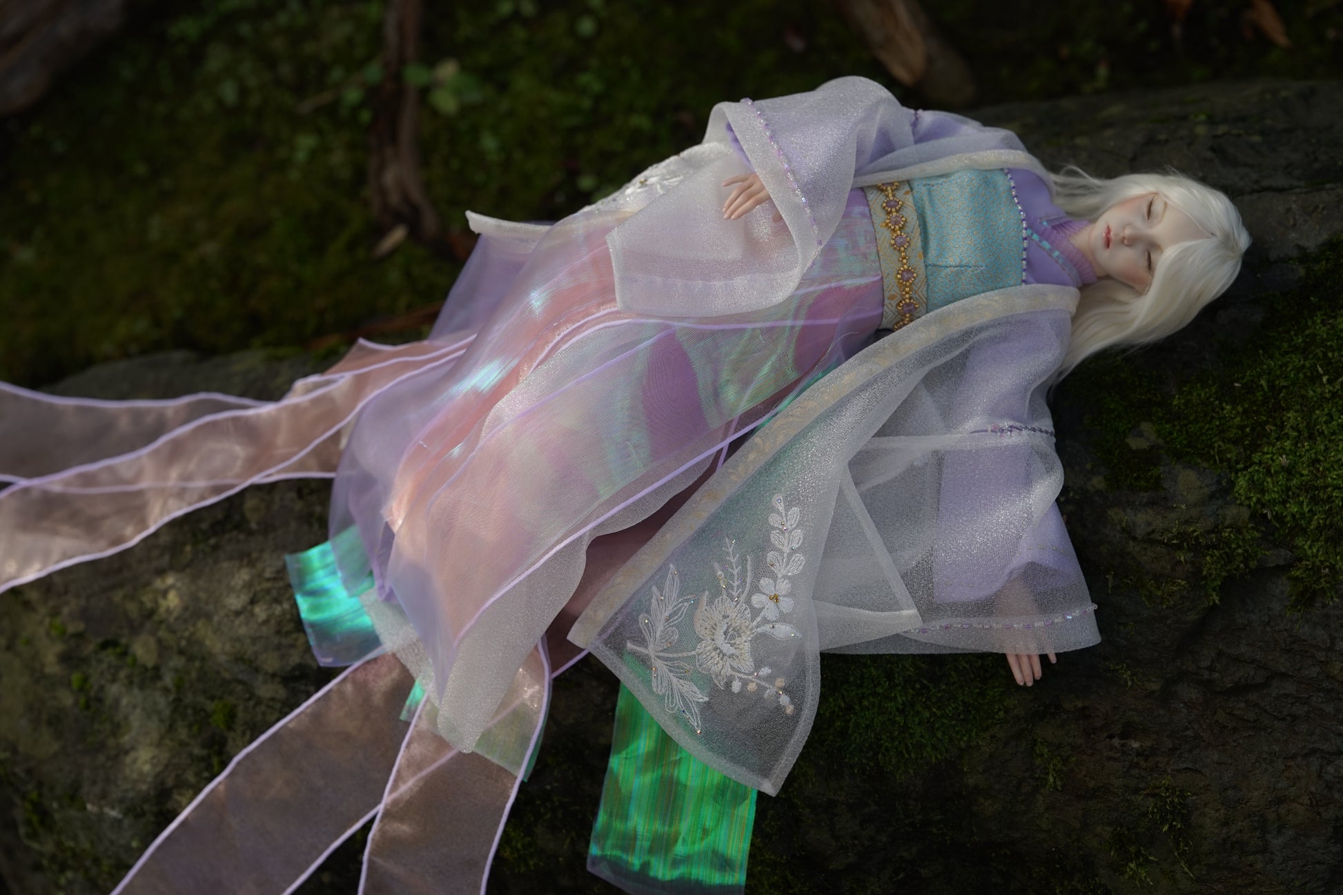 ほのかな香りを想起させる「薫」と名付けられたこの人形は、長いまつ毛と、神秘的な雰囲気を漂わせる穏やかな目を閉じた表情が特徴です。中国の伝統的な漢服と日本の着物の要素が融合した衣装は、流れるようなリボンが風に優雅に舞う天女のような、優美な存在感を醸し出しています。 (このページは展示のみです。ご購入のお問い合わせはお問い合わせください。)