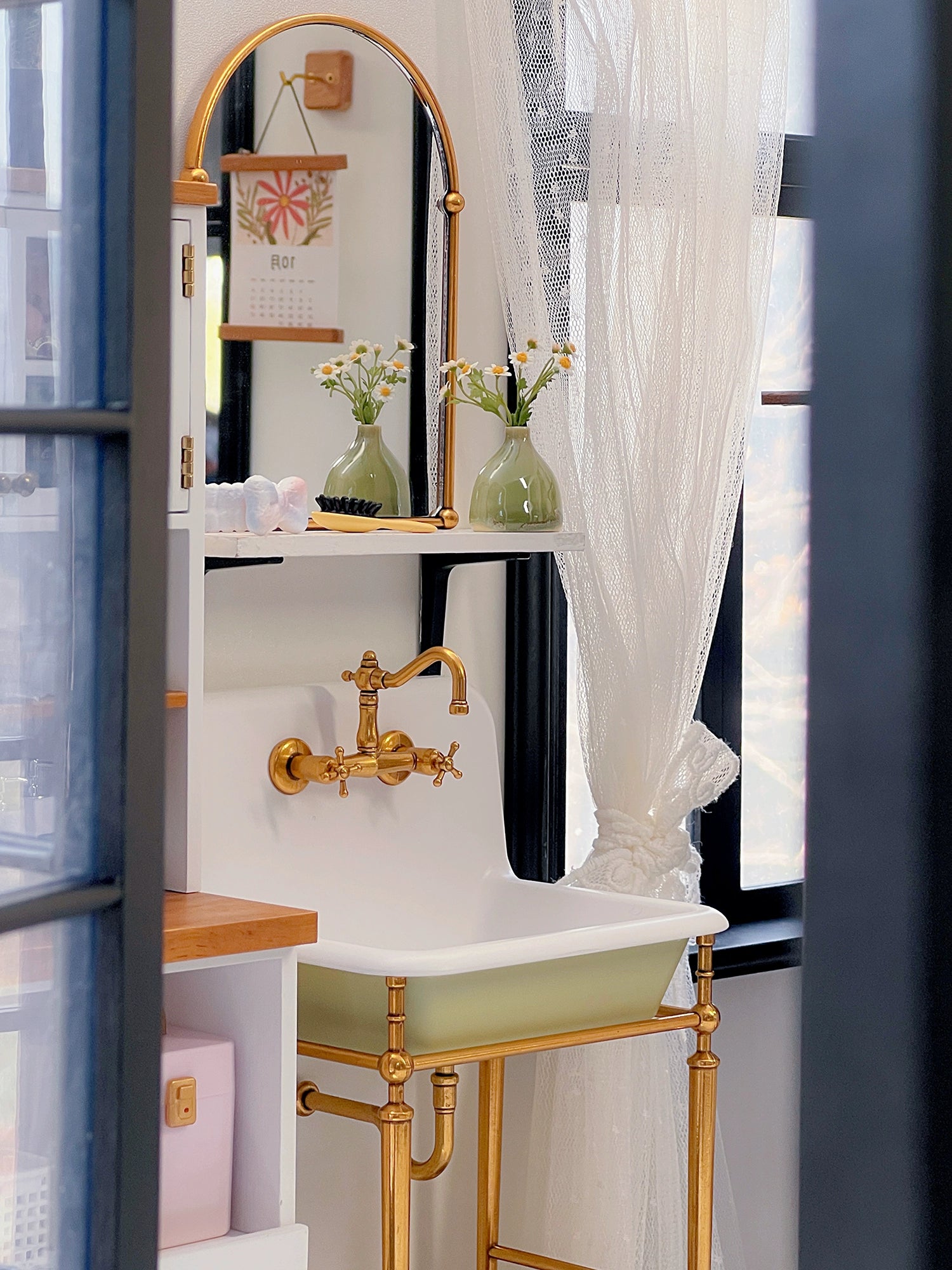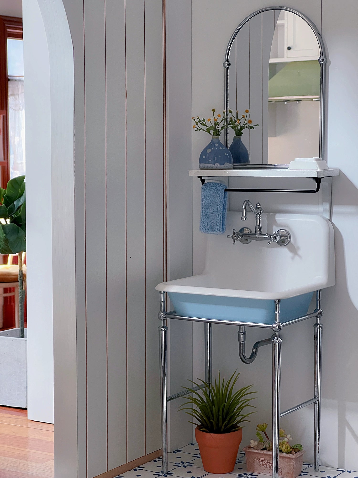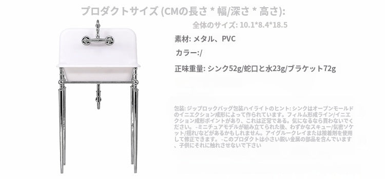 1/6スケールのヴィンテージ風ミニチュア家具です。BJD、ブライス、OB11などの1/6スケールドールに対応し、洗面台・鏡・蛇口などのパーツを揃えています。