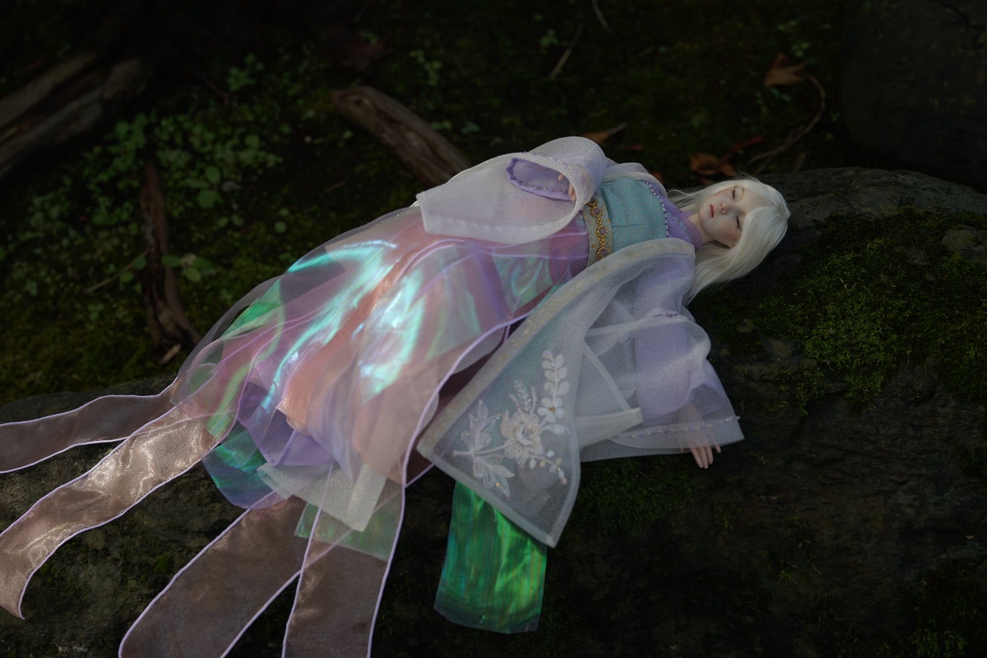 Named Kaoru, evoking the image of a faint fragrance, this doll features long lashes and a serene closed-eye expression full of mystery. Her outfit blends traditional Chinese Hanfu with Japanese kimono elements, while flowing ribbons create the ethereal presence of a celestial maiden, drifting gracefully with the wind.
